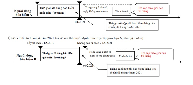 - Do cải cách trong bộ luật về phương thức tính tiền lương hưu trọn gói nên từ tháng 4 năm 2021 khoảng thời gian đã tăng từ 36 tháng (3 năm) lên 60 tháng (5 năm). Cải cách này chỉ áp dụng cho những đối tượng có tháng cuối nộp phí bảo hiểm(tháng tiêu chuẩn) từ sau tháng 4 năm 2021.