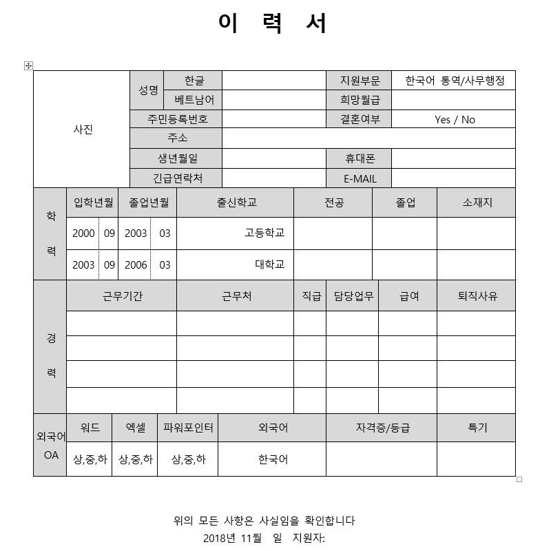 - Người Hàn Quốc rất quan tâm đến học vấn, vì vậy các bạn hãy viết phần này thật chi tiết và cẩn thận.