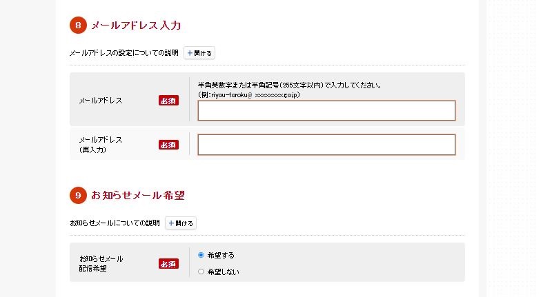 Bước 8: Nhập địa chỉ email của bạn vào 2 ô「メールアドレス」và 「メールアドレス再入力」. Chọn vào 「希望する」trong mục「お知らせメール希望」 để nhận thông báo về email.