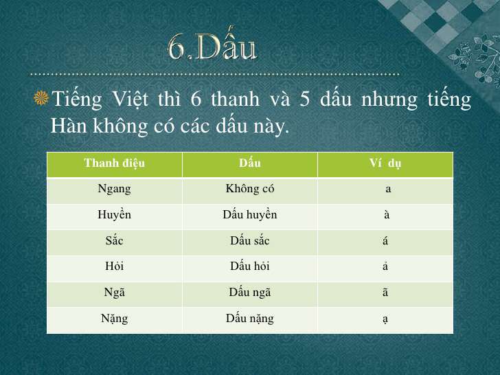Tiếng Việt có đến 6 thanh điệu, trong khi đó, tiếng Hàn hoàn toàn không sử dụng thanh điệu.