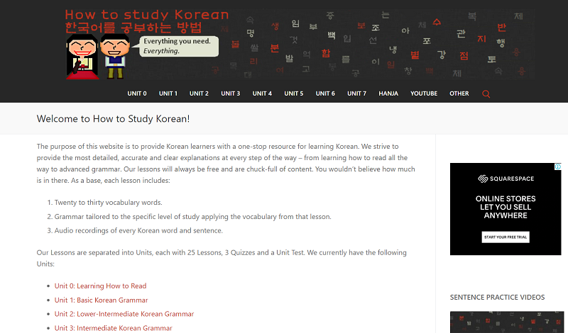 How to study Korean gồm 7 cấp độ: Learning How To Read, Basic Korean Grammar, Lower – Intermediate Korean Grammar, Intermediate Korean Grammar, Upper – Intermediate Grammar, Lower – Advanced Korean Grammar, Advanced Korean Grammar. Từng cấp đều có đầy đủ 25 bài học, 3 bài Quizzes và 1 bài kiểm tra. Không chỉ đưa ra kiến thức nền mà trang web còn giải thích cụ thể và đưa ra nhiều mẫu câu cho các tình huống thực tế để bạn có thể thực hành.